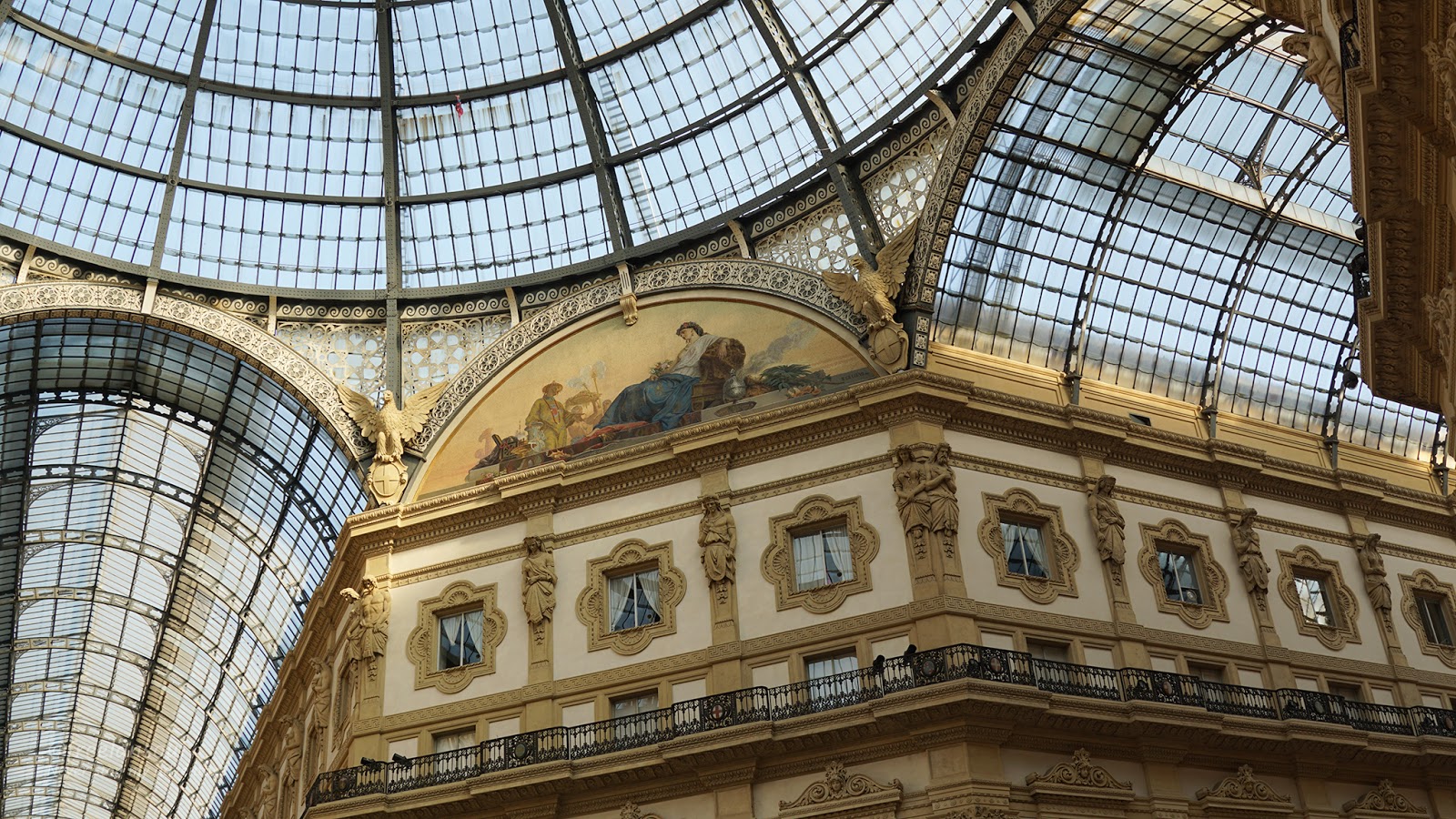 從大教堂廣場的凱旋門走進去,映入眼簾的是極緻絕美的拱廊。當陽光透過上方的拱型玻璃屋頂,照射著牆上精緻的浮雕和壁畫時,著實是神來之筆!